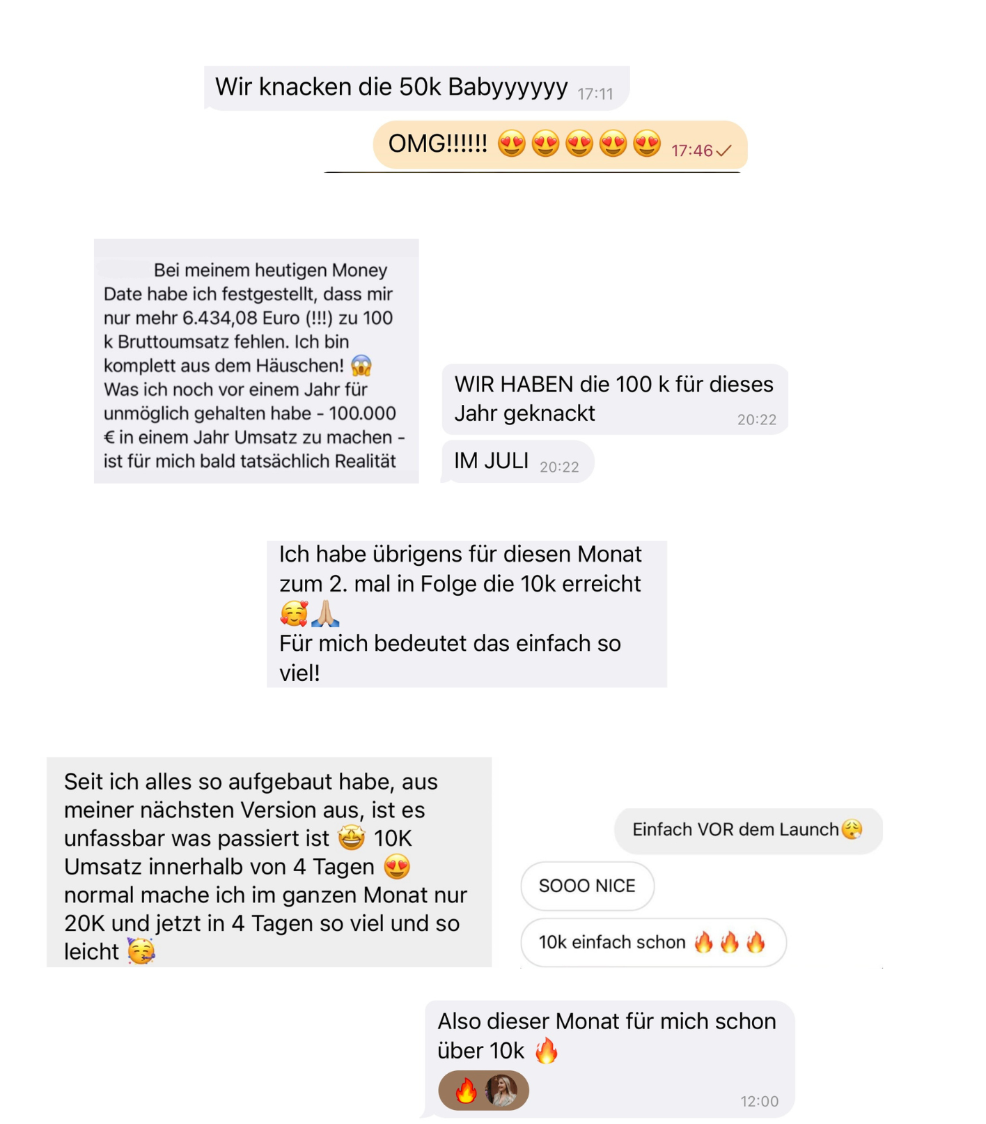 Bisher habe ich mit über 2.000 Frauen gearbeitet und sie auf ihrem Weg supportet – mit outstanding Ergebnissen. Viele meiner Kunden machen heute 6- oder 7-stellige Jahresumsätze, reisen um die Welt und erleben wahre Freiheit.